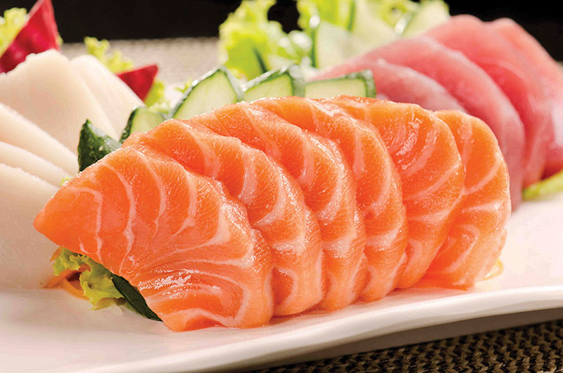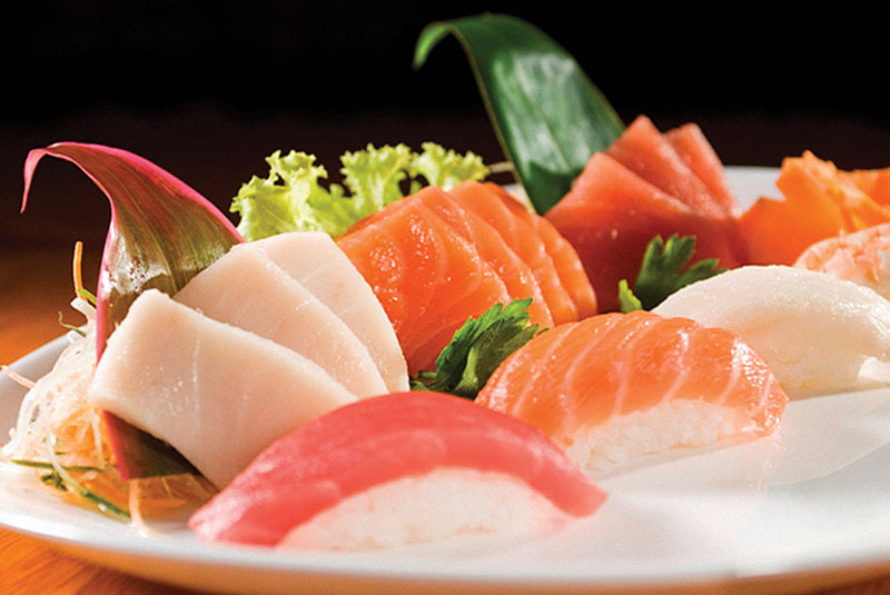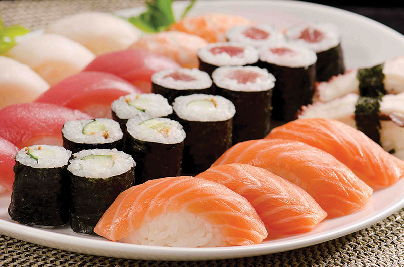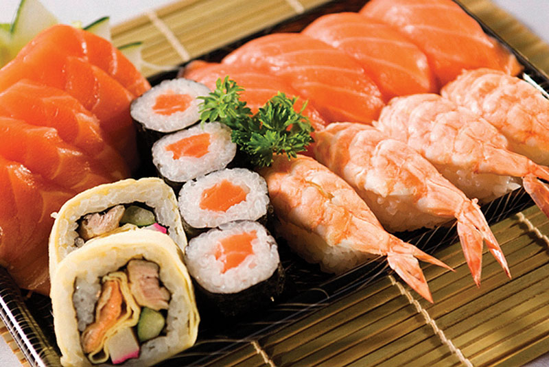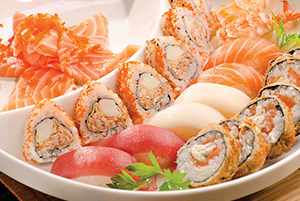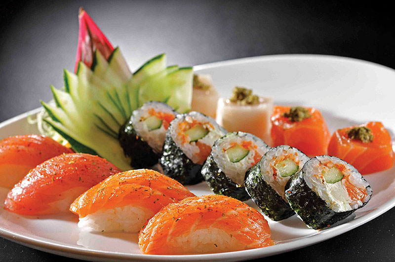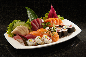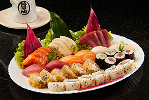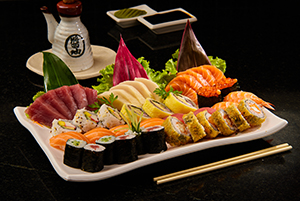 15 sashimi, 8 sushi, 2 sushi de ovas de salmão, 3 kappamaki, 3 tekkamaki, 6 hot, 3 futomaki e 3 califórnia