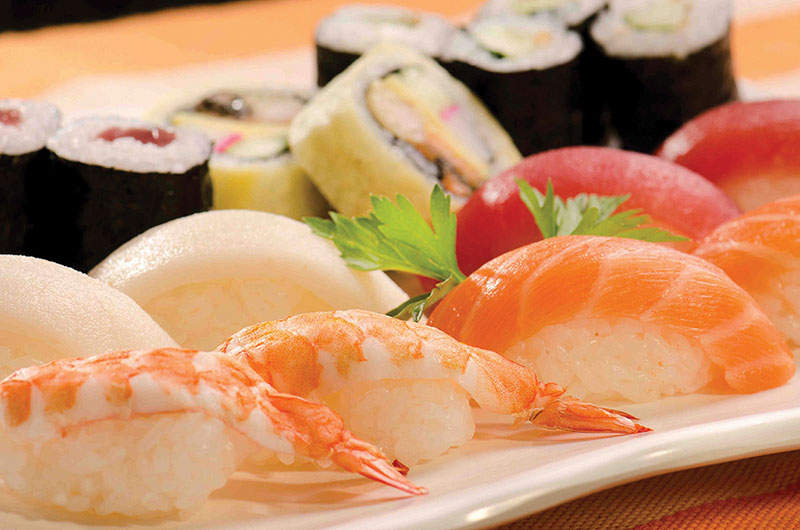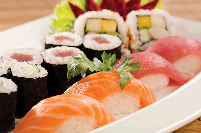 12 sashimi, 6 sushi, 3 califórnia, 2 jô jô, 2 shakkemaki, 2 tekkamaki e 2 kappamaki