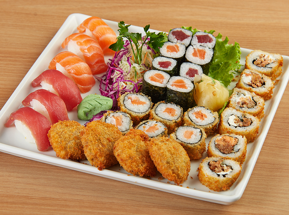 6 nigiri, 6 hot de salmão, 6 hot filadélfia skin, 4 shakkemaki, 4 tekkamaki e 4 nuggets de atum